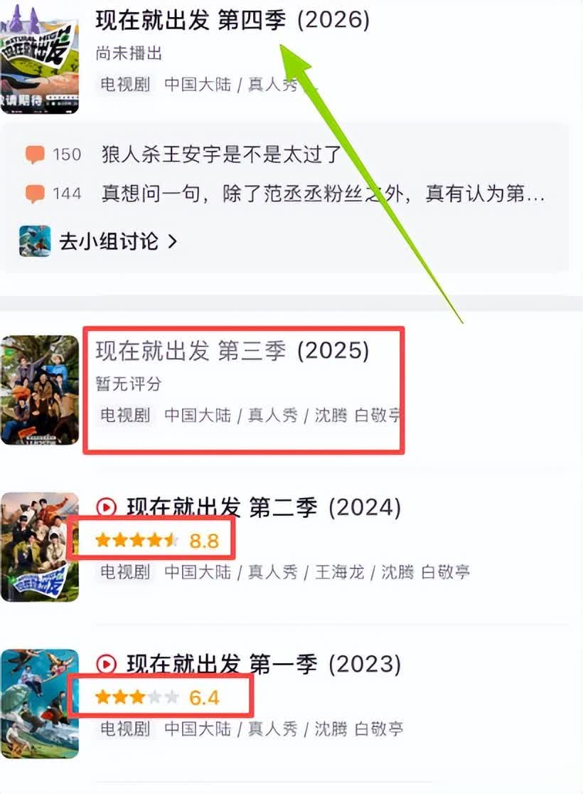 于是,《现在就出发1》只有6.4分,第二季飙到8.8分后,第三季又原班人马的回归了。
