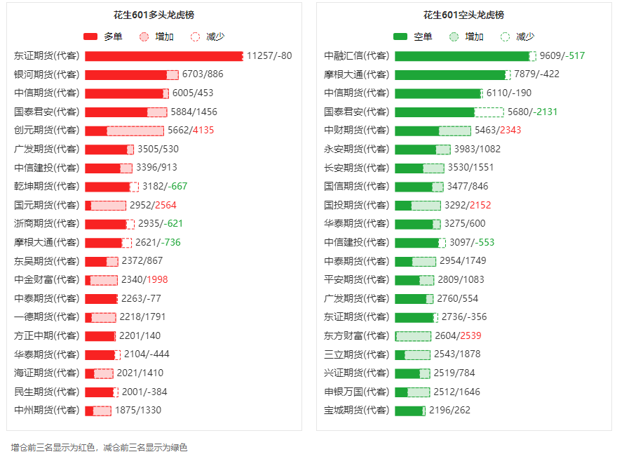 总体而言,花生601合约今日增仓上行,多空持仓排名前20席中,多空双方均呈进场态势,多头进场意愿弱于空头。