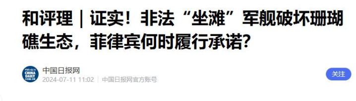 2.中国日报网-《和评理|证实!非法“坐滩”军舰破坏珊瑚礁生态,菲律宾何时履行承诺?》-2024-07-11