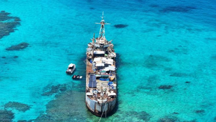 仁爱礁那艘非法“坐滩”的破旧军舰,就是摆在那里的铁证,这艘军舰,在礁盘上趴了二十多年,船体严重锈蚀。